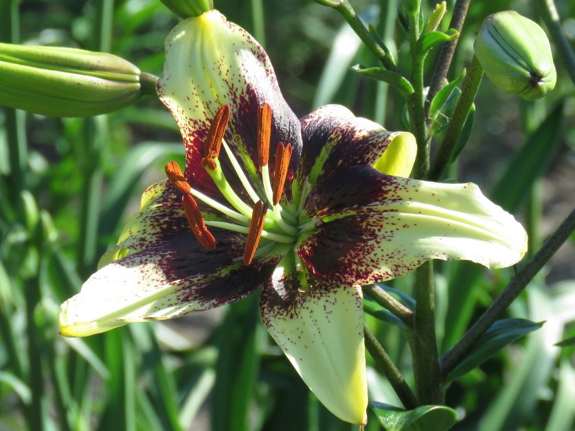 Finally, Flickertail, its garden name was gopher, explodes in the garden with an explosion of burgundy speckles across creamy yellow petals. Not unlike the gopher hole first made and then excavated even deeper and wide by our helpful dog, Shrew.