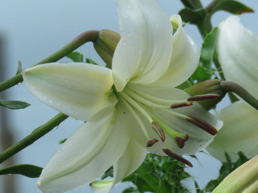 Fresh Canvas is full circle to the beginnings of my enjoyment of lilies. One of my first gardens was a white garden, billowing with tall white nicotiana, white petunias, gaura, a white rose, and creamy-white lilies. I remember cutting a stem of those pristine lilies and bringing it indoors and setting the stem in a vase at my front window. Now here, I bring forth Fresh Canvas, a different take on the creamy whites, it glows a bit with green and faces outwards, adding new dimension to the usual cut-flowers that only face up.